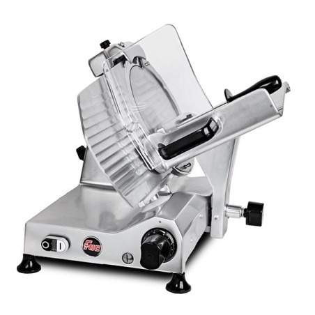 L'affettatrice modello F300R costruita in lega di alluminio trattata anodicamente ha il vantaggio di una rapida pulizia ed assoluta igiene. Il regolatore dello spessore di taglia da 0 a 16mm è molto sensibile e permette una regolazione decimale. L'affilatoio di facile montaggio semplifica il lavoro dell'utente mantenendo efficiente il taglio perfetto della merce. Il piatto montato su cuscinetti a sfere ha una scorrevolezza eccezionale e permette di tagliare salumi pesanti, arrosti, formaggi, pesce, carni dure ed altro.