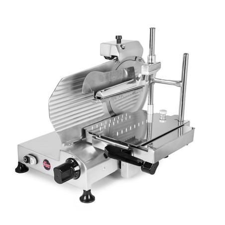 L'affettatrice modello F300 TS-V R costruita in lega di alluminio trattata anodicamente ha il vantaggio di una rapida pulizia ed assoluta igiene. Il regolatore dello spessore di taglia da 0 a 16mm è molto sensibile e permette una regolazione decimale. L'affilatoio di facile montaggio semplifica il lavoro dell'utente mantenendo efficiente il taglio perfetto della merce. Il piatto montato su cuscinetti a sfere ha una scorrevolezza eccezionale e permette di tagliare salumi pesanti, arrosti, formaggi, pesce, carni dure ed altro.