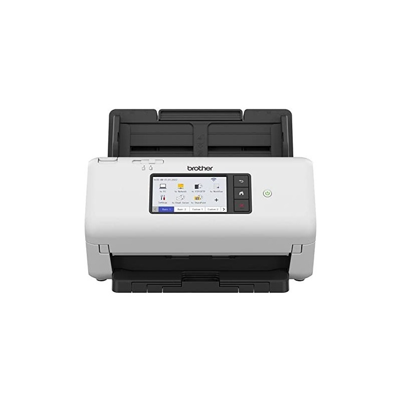 Scanner professionale molto veloce, con connessione tramite USB, rete cablata o WiFi. Può scansionare fino a 80 pagine fronte/retro al minuto e ha una capacità di alimentazione di 80 fogli (ADF). Consente di eseguire la scansione direttamente nelle cartelle di rete senza la necessità di essere collegati a un PC. Il touch screen contribuisce alla produttività, consentendo di creare collegamenti a qualsiasi cartella di rete. Funzioni standard: Scansione su PC, Immagine, Rete (SMB), Server e-mail, Flusso di lavoro, FTP/SFTP, SharePoint (On Premise), Brother Web Connect, Scansione su HTTP(S), Brother Apps