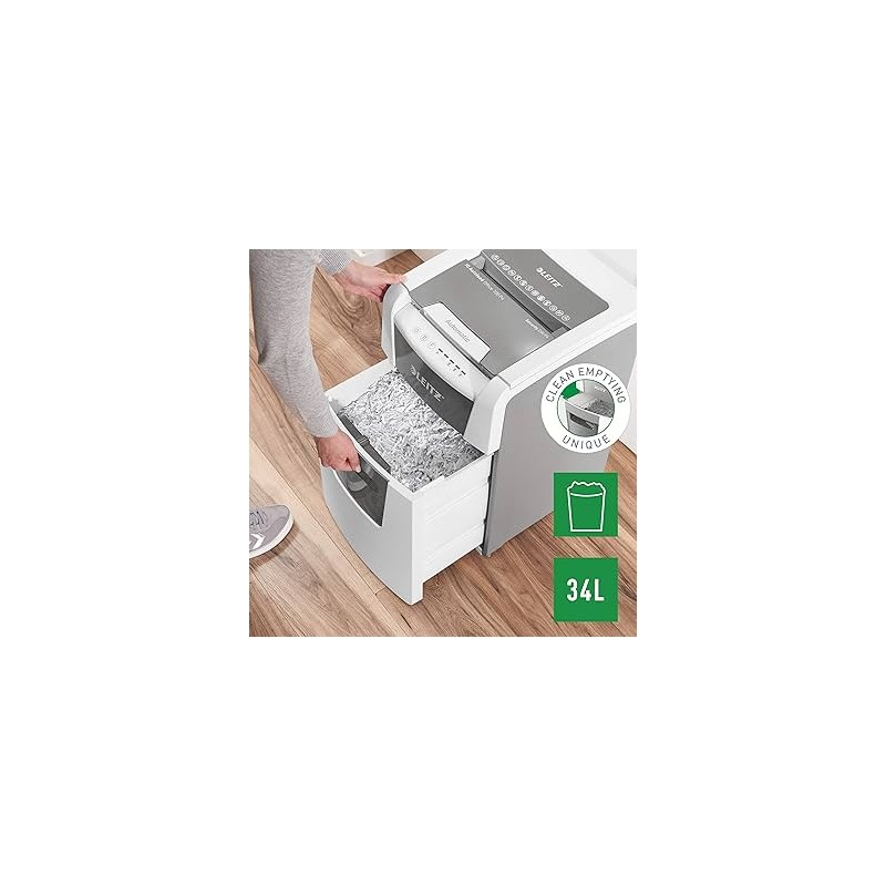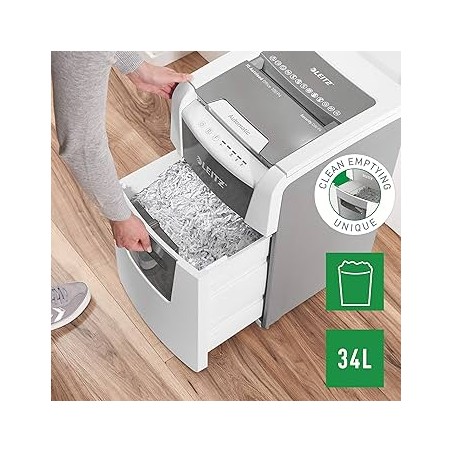 Il distruggidocumenti automatico per piccoli uffici Leitz IQ 100 Autofeed P4 è un distruggidocumenti intelligente, silenzioso, pulito e sicuro. Con la capacità di distruggere automaticamente 100 fogli, questa macchina è perfetta per l'uso quotidiano in un piccolo ufficio. Il suo cestino rimovibile ha una capacità di 34 litri, consentendo una triturazione continua senza la necessità di svuotarlo costantemente.
