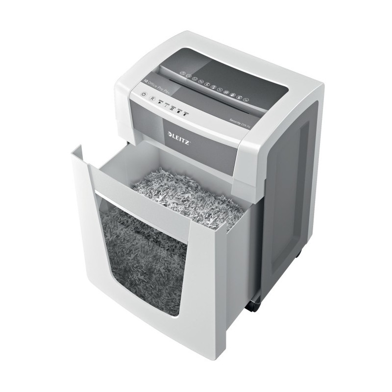 Il distruggidocumenti Leitz IQ Office Pro P6+ si distingue anche per il suo cestino da 30 litri, che può contenere fino a 390 fogli prima di dover essere svuotato. Inoltre, ha quattro ruote di alta qualità che ne facilitano la mobilità.