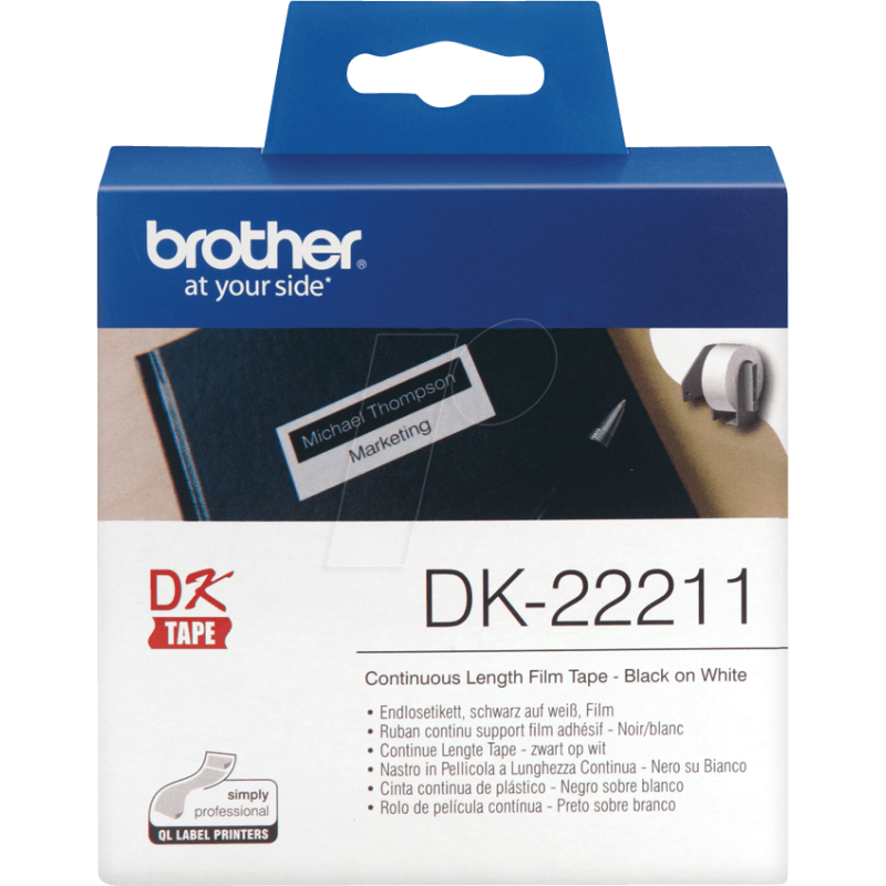 Il nastro continuo DK22211 (testo nero su sfondo bianco) consente di creare etichette con dimensioni personalizzate. Il materiale è una pellicola di plastica, più sottile e leggera della carta adesiva convenzionale. La componente plastica della superficie le conferisce maggiore resistenza rispetto alle etichette in carta e un tocco più morbido. Progettato per l'identificazione temporanea, l'adesivo è sviluppato per evitare che l'etichetta si stacchi prima del previsto. Se la lunghezza delle informazioni che devono figurare sulle etichette varia, i nastri continui sono l'opzione migliore. Puoi incorporare in modo facile e veloce: immagini, loghi, codici a barre, date o qualsiasi altra informazione.