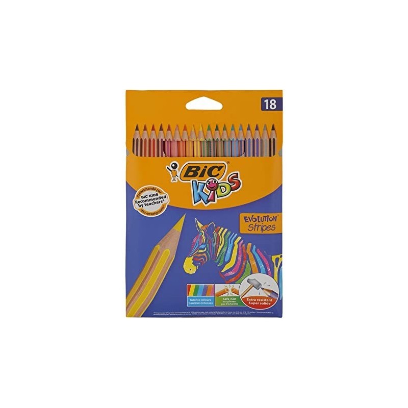 Matite colorate Bic Kids Evolution Stripes, blister 18 colori assortiti. Matite molto resistenti, realizzate in resina, senza legno. Piombo 3,20 mm, Toni vividi e coprenti. Consigliato dagli insegnanti. Si affilano facilmente. Non si scheggiano.