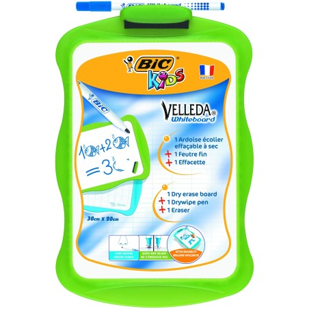 Perfetta per imparare a scrivere, la lavagna BIC Velleda Kids ha due lati, uno liscio e l'altro squadrato. Un bravo studente è sempre ben preparato, quindi questa lavagna include un pennarello blu e una gomma che si aggancia facilmente alla lavagna. Questa versione 20 x 30 cm è molto utile per la scuola e si adatta a qualsiasi zaino.