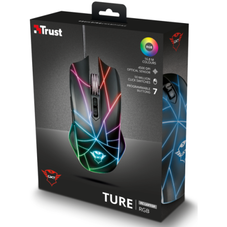 Con 7 pulsanti programmabili, illuminazione RGB regolabile, un interruttore DPI che consente di scegliere la velocità del cursore e un design ambidestro perfetto per i giocatori mancini o destrimani, il GXT 160X Ture di Trust è un autentico mouse da gioco completamente personalizzabile.
