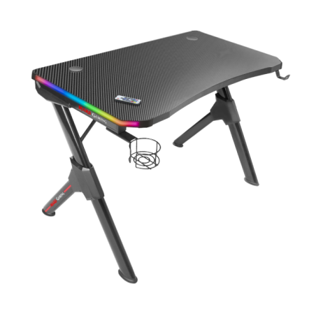 Con il suo sistema di illuminazione RGB controllato da telecomando. Massima stabilità e durata utilizzando il miglior acciaio e un pannello laminato con fibra di carbonio e finitura impermeabile, sistema di gestione dei cavi e supporti esterni per cuffie e bevande. Tutto questo mantenendo dimensioni compatte per adattarsi facilmente a qualsiasi spazio.